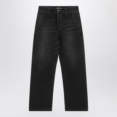Fear of God black washed-effect cotton denim jeans, featuring belt loops, two side pockets, two back pockets, zip and button closure, and embossed logo label on the front. Size and Fit - Model wears size 32 Model measurements: Height: 189 cm Chest: 104 cm Waist: 78 cm Hips: 95 cm