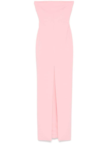 Light-pink strapless gown in stretch crepe with a figure-skimming silhouette. Features a concealed back zip with hook, front slit, full lining, and a clean straight hem—elegant and evening-ready.