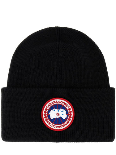 black black merino wool ribbed knit appliqué logo turn-up hem Logo wool beanie