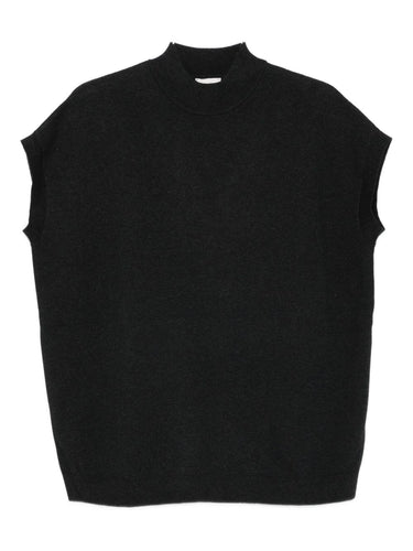black, mock neck, cap sleeves, straight hem. Cotton blend vest
