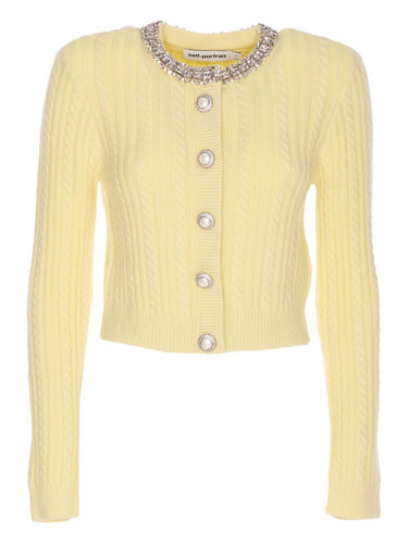 pale yellow cable knit crystal-embellished collar jewelled button-closure long sleeves crew neck Crewneck cardigan