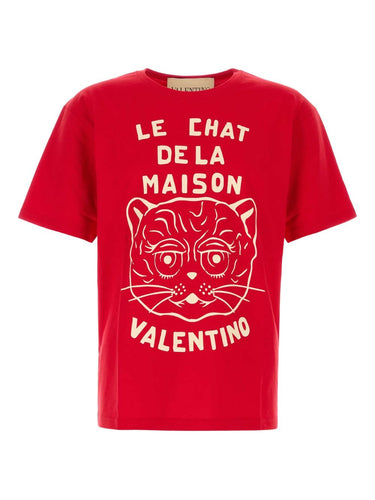 red front graphic featuring cat design le chat de la maison text detail crew neck short sleeves Le Chat De La Maison cotton t-shirt