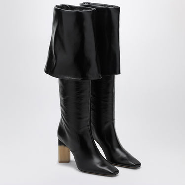 High Chloé boot in shiny black leather, featuring a high foldable shaft, square toe, thick horn-effect high heel with engraved logo, and leather sole. Size and Fit - Heel 8,5 cm