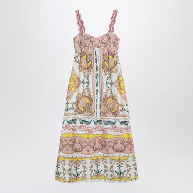 Farm Rio dress in a white linen and viscose blend with a colourful marine pattern all over, featuring two side welt pockets, a sweetheart neckline, intertwined pink straps, a bra with seams, and a back zip closure. Size and Fit - Model wears size S Model measurements: Height: 178 cm Chest: 89 cm Waist: 62 cm Hips: 88 cm