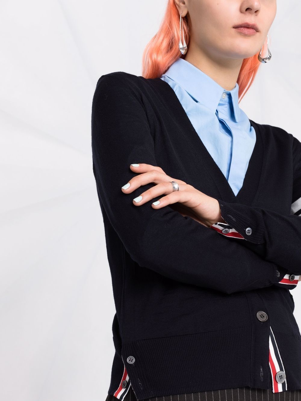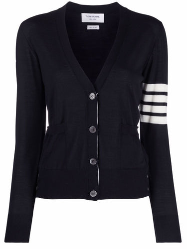 navy merino wool fine knit signature 4-Bar stripe stripe trim V-neck front button fastening side button fastening long sleeves ribbed cuffs ribbed hem two front patch pockets Wool cardigan