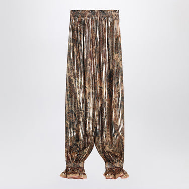 Valentino pants in metallic effect beige silk blend with floral pattern, characterized by pleated design and elasticized waist and ankles. Size and Fit - Model wears size 40 IT Model measurements: Height: 178 cm Chest: 89 cm Waist: 62 cm Hips: 88 cm