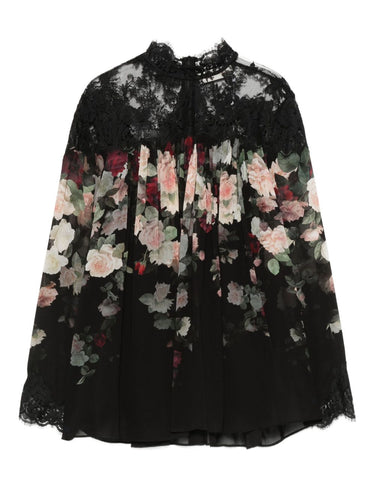 black rose print lace detail long sleeves pleated bodice Printed blouse