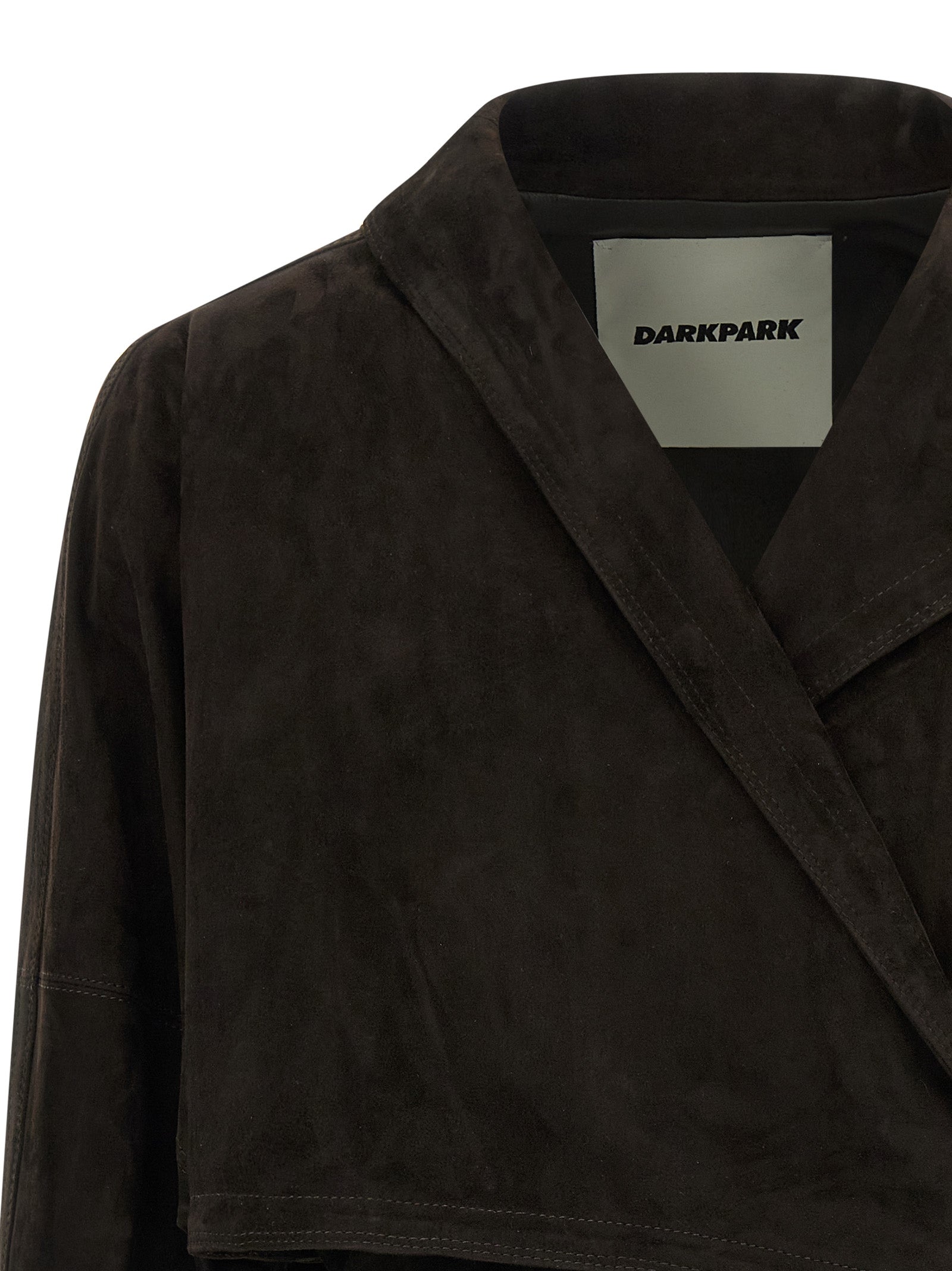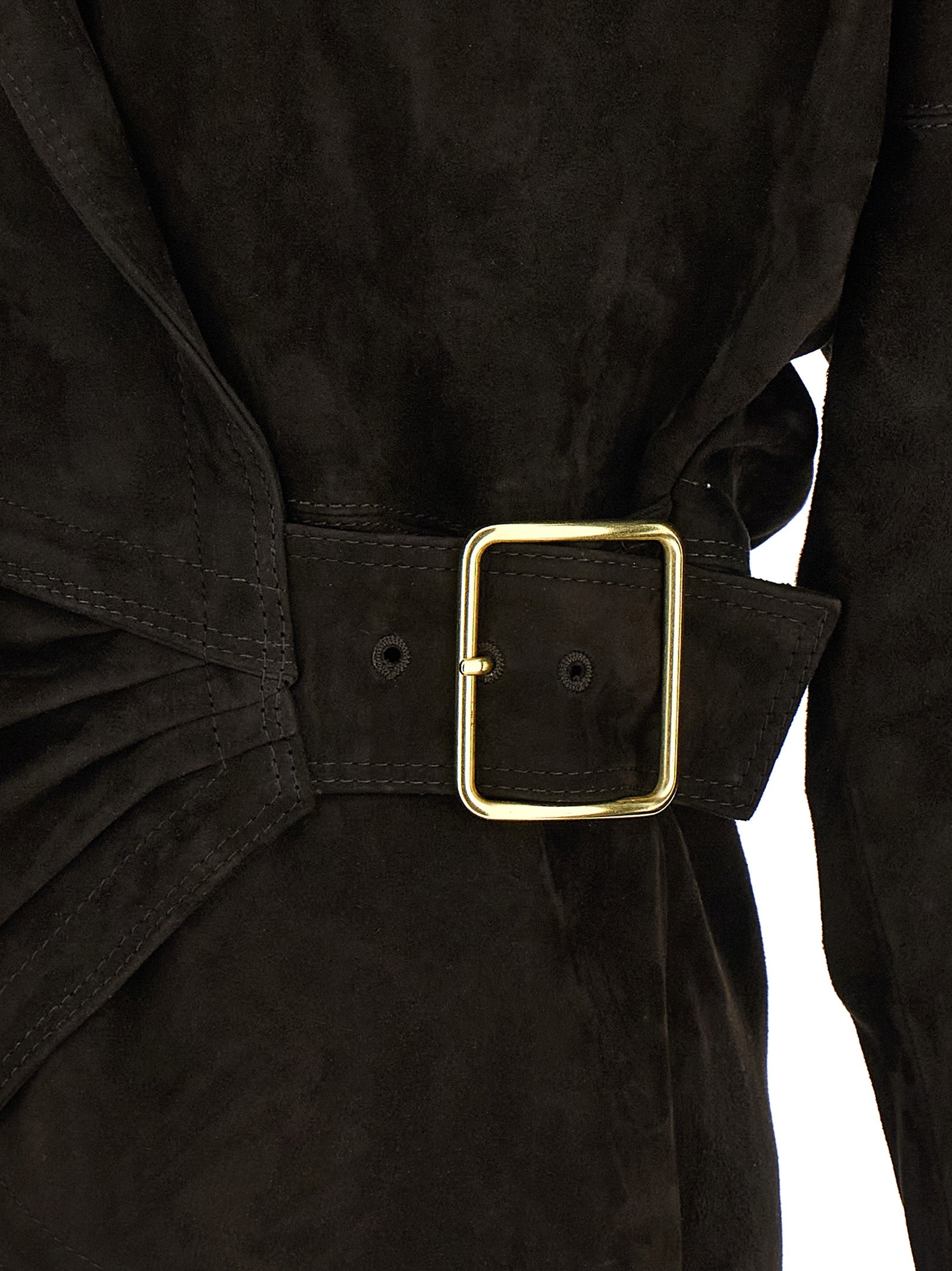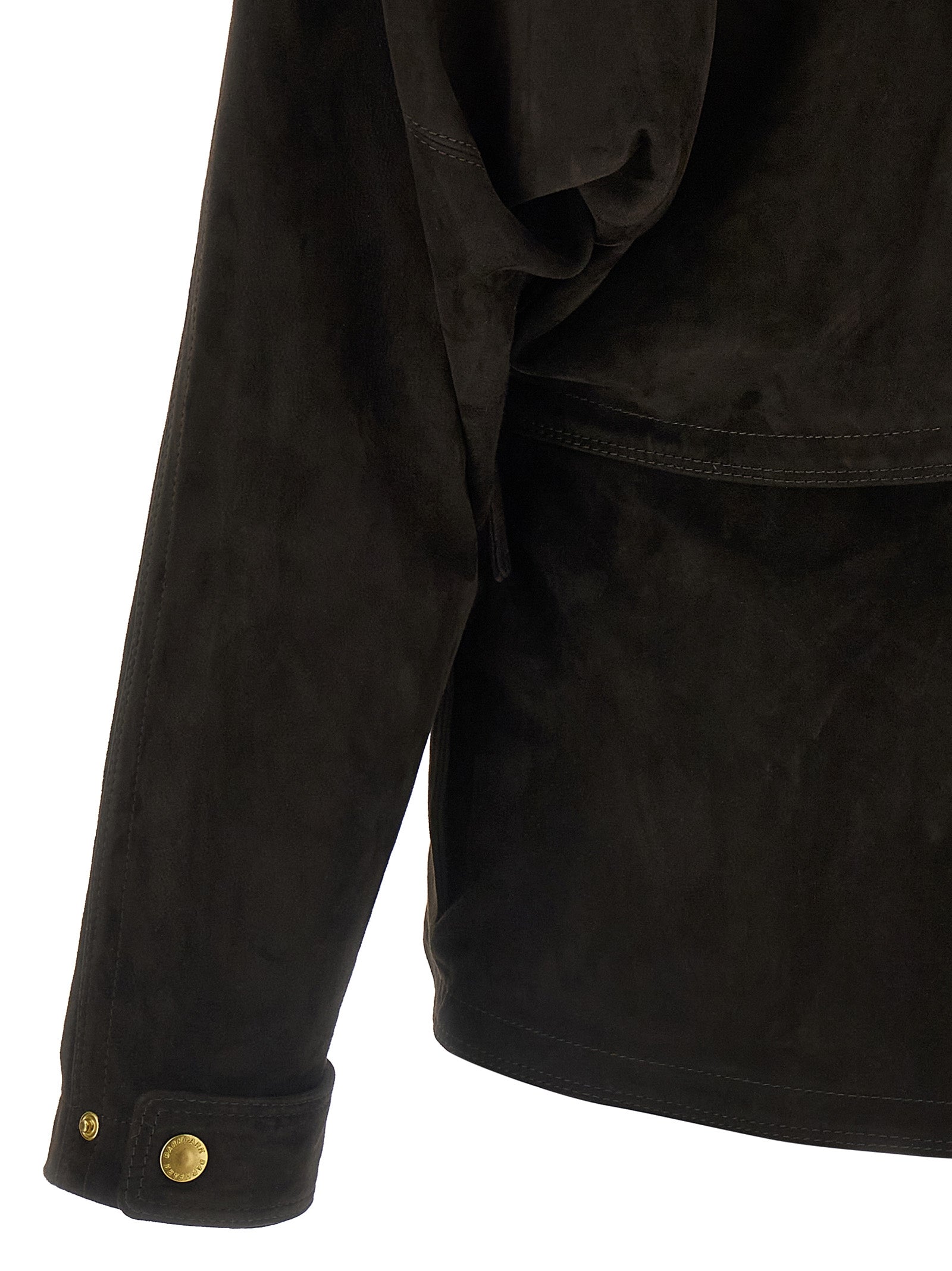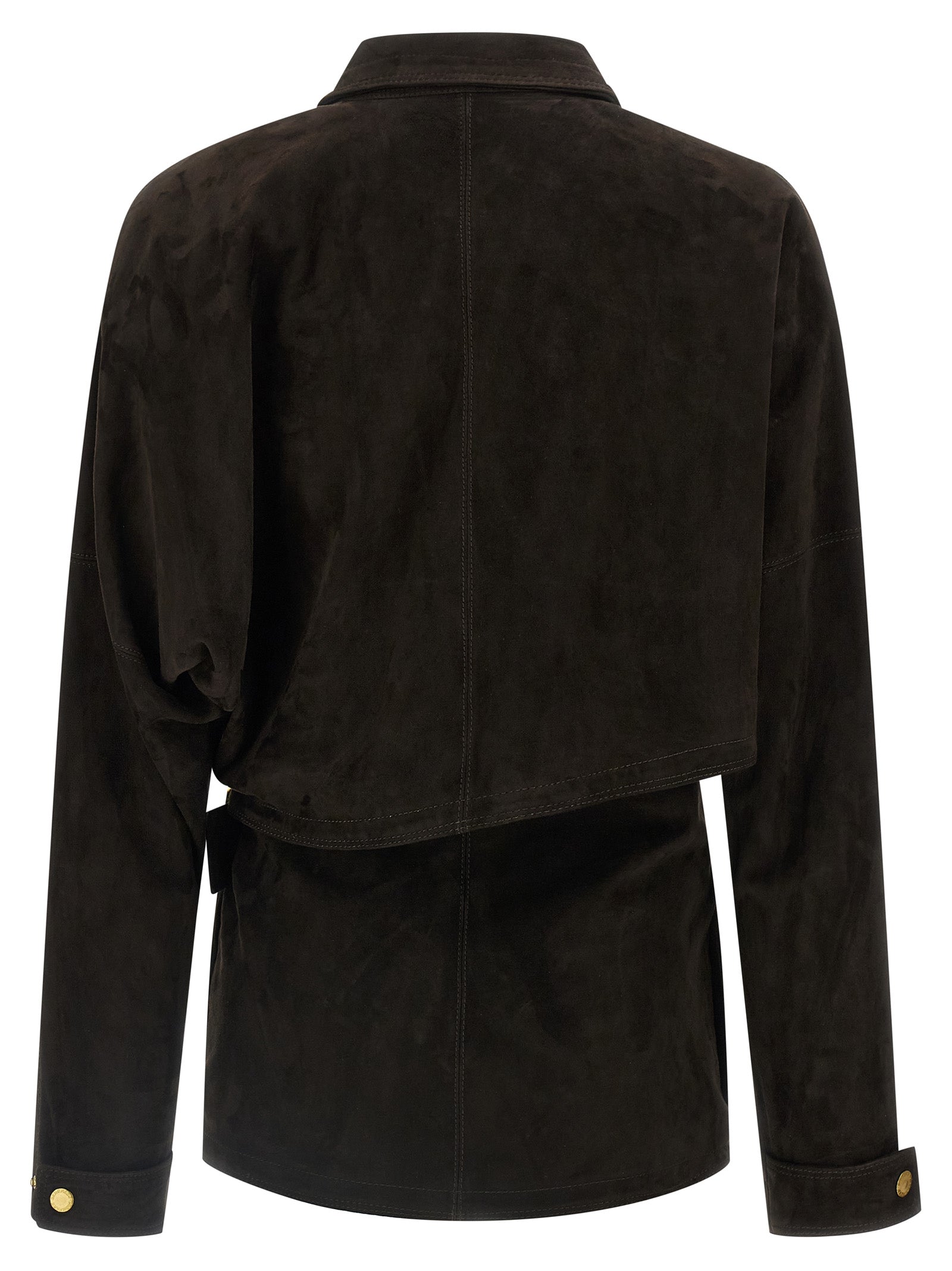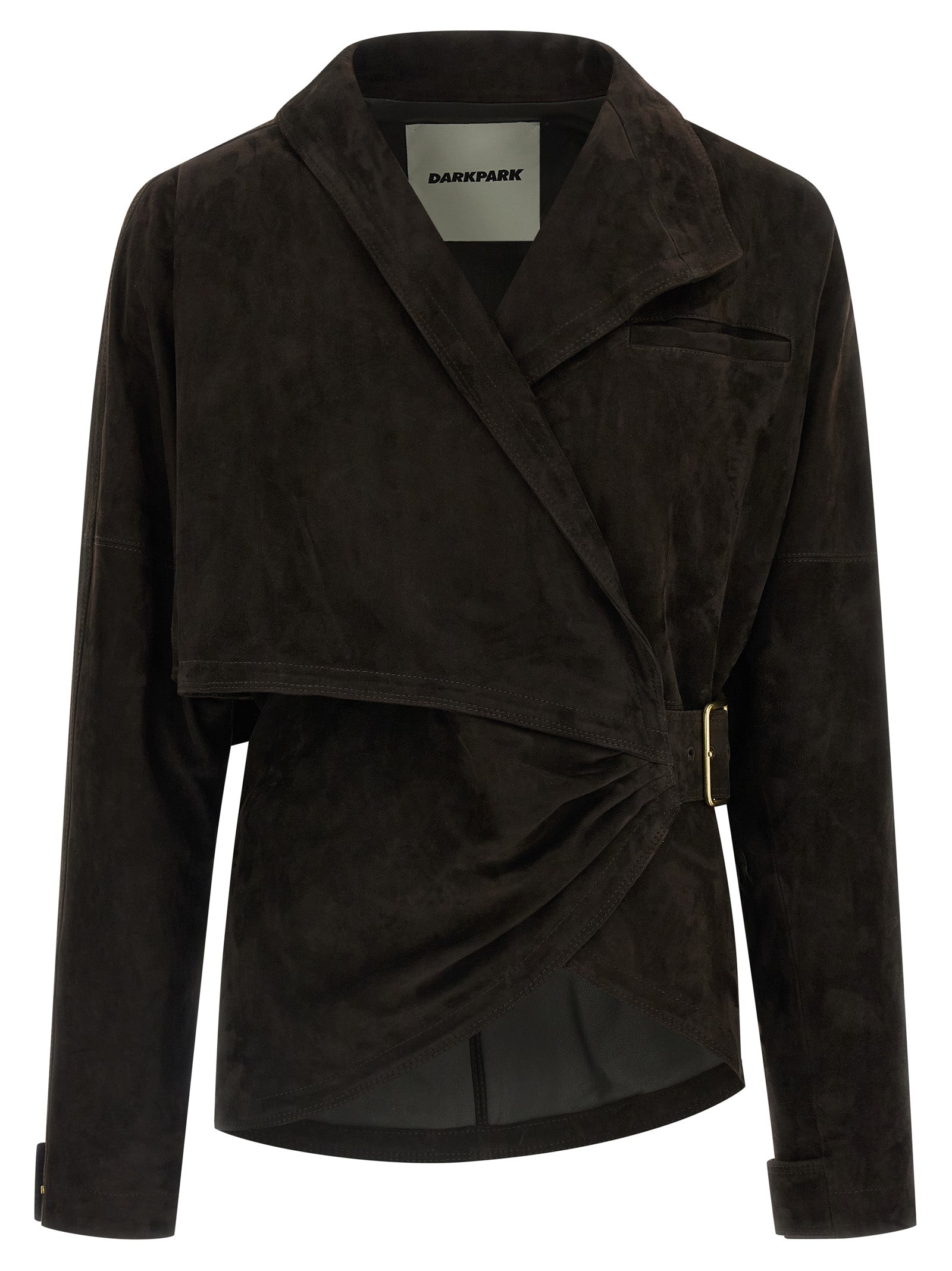 'Cindy' suede jacket with front crossed button closure inside antiqued gold metal buckle, V-neck with lapels, slightly worn out, back cape, long sleeves with adjustable cuffs with snap buttons. Size and Fit - True to size fit