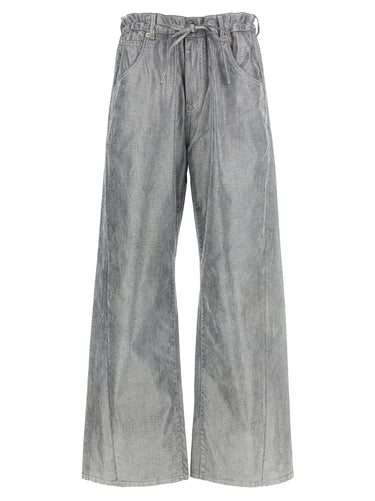 'Iris' cotton denim jeans with flocked and metallic effect, drawstring at the waist, front zip and snap button closure, five pockets, wide leg, leather logo label at the back. Size and Fit - Relaxed fit