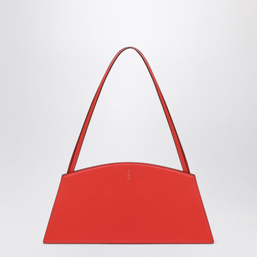 Noesi poppy red smooth leather bag, featuring an elongated design, hidden magnetic closure, two long handles, and small contrasting embossed logo lettering on the front. Size and Fit - Width 32 cm x Height 15,5 cm x Depth 9,5 cm Handle drop: 25 cm