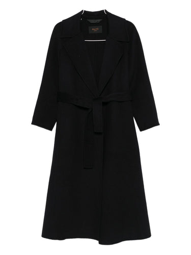black wool self-tie belt notched lapels long sleeves A-line hem Paola wool coat