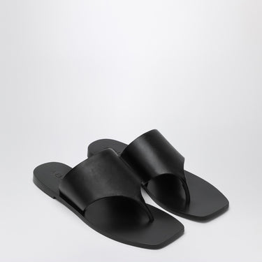 Black leather flip-flops by A.Emery, characterized by a square thin insole and leather sole.