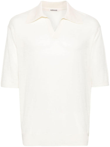 ivory white wool-silk blend mélange effect polo collar V-neck short sleeves ribbed cuffs and hem straight hem Wool and silk blend polo shirt Size and Fit - This piece fits true to size. We recommend you get your regular size. Model is 1,84m / 6ft 1in wearing size 2 (NUM)