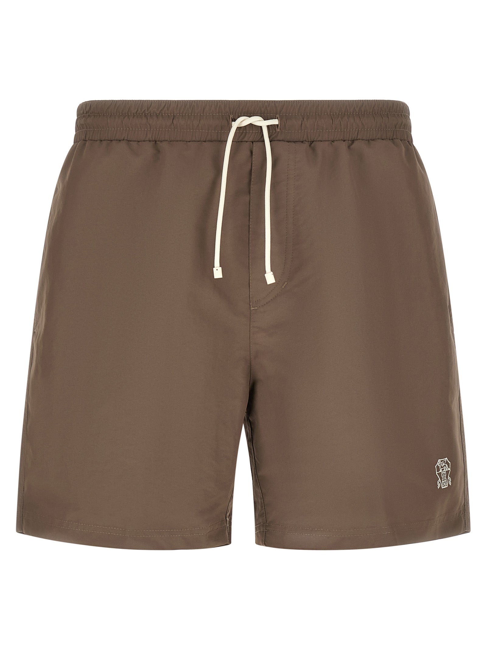 Matt nylon swimsuit, Embroidered logo heraldic coat of arms of solomeo on the front, Elastic with drawstring at the waist, Trompe l'oeil flap, Pockets, Inner mesh briefs. Size and Fit - true to size fit
