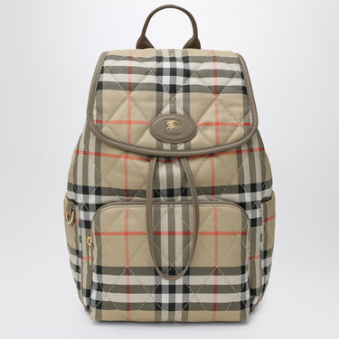 Burberry quilted beige nylon backpack with all-over Check motif, featuring one top handle, adjustable shoulder straps, drawstring closure, flap with Equestrian Knight Design logo, leather details, one front zip pocket and two side pockets, one with eyelet detail. Size and Fit - Width 21 cm x Height 34 cm x Depth 13 cm