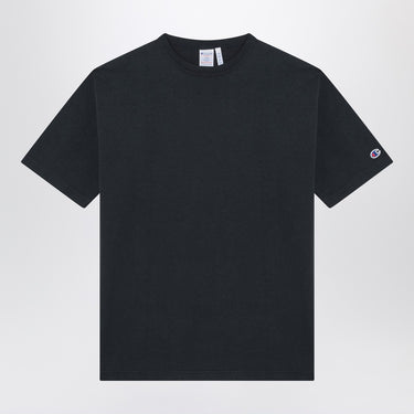 Navy blue cotton Champion crew-neck T-shirt, featuring short sleeves with small logo patch and straight hem.
