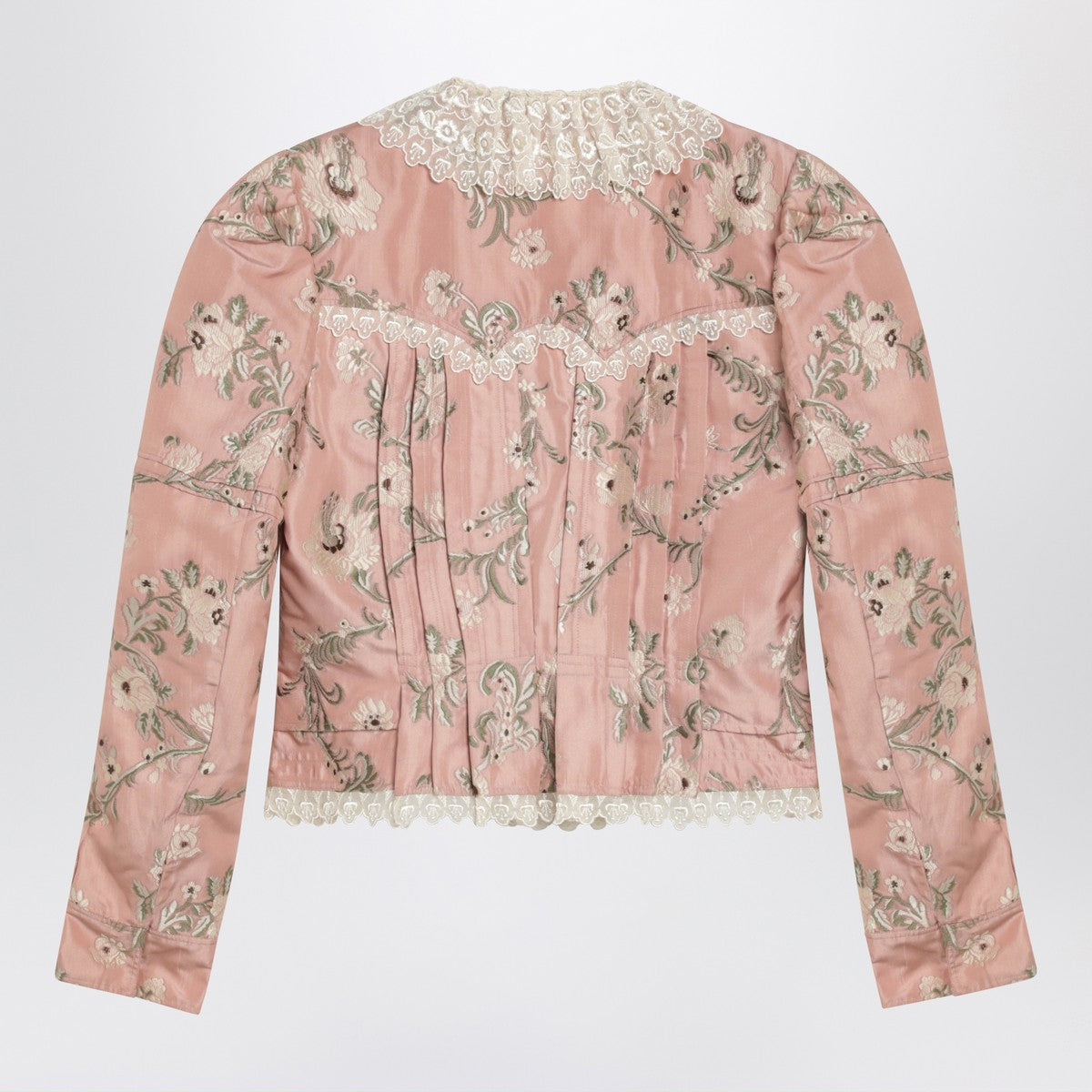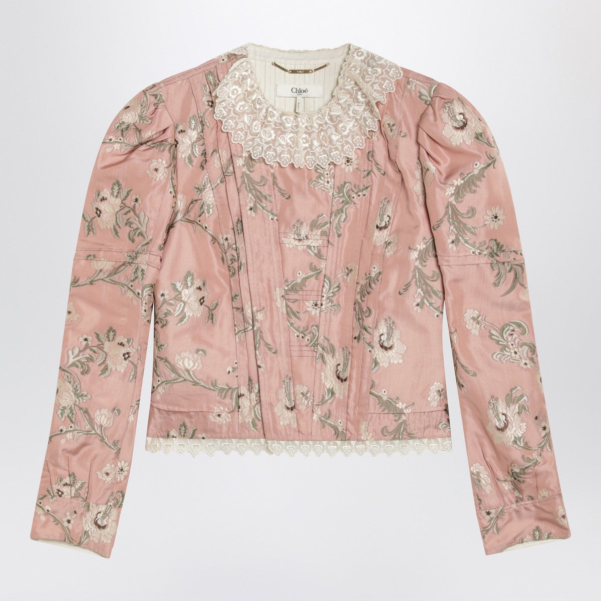 Chloé jacket in silk-blend taffeta with pink-tone floral jacquard featuring a baroque design, lace details, puffed shoulders, hook closure, and fitted silhouette. Size and Fit - Model wears size 36 FR Model measurements: Height: 182 cm Chest: 79 cm Waist: 62 cm Hips: 90 cm