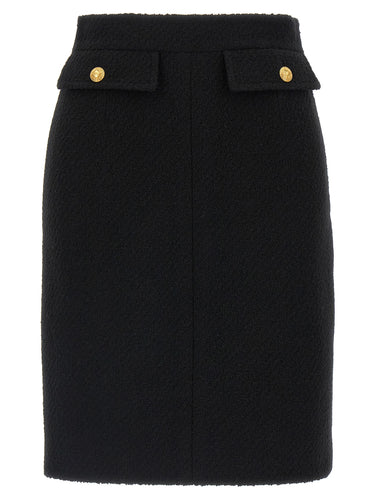 Midi skirt in bouclé wool, silk lining, trompe l'oeil pockets, side zip closure. Size and Fit - true to size fit - FRENCH size