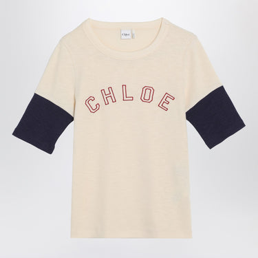 Chloé T-shirt in white and blue wool and cotton, featuring a crew neck design, short sleeves with contrasting blue bands, and a front logo print. Size and Fit - Model wears size S Model measurements: Height: 179 cm Chest: 82 cm Waist: 65 cm Hips: 90 cm