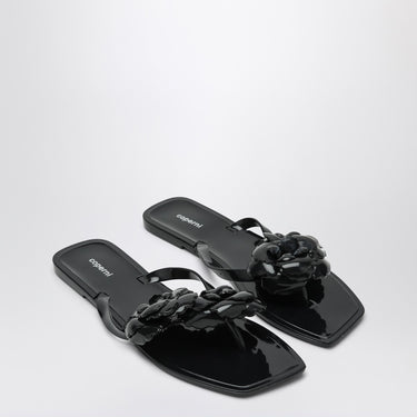 Black silicone flip-flops by Coperni, featuring applied flowers on the front, insole with logo, and flat silicone sole. The product may present possible effects due to the PVC moulding process.