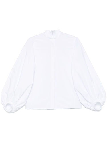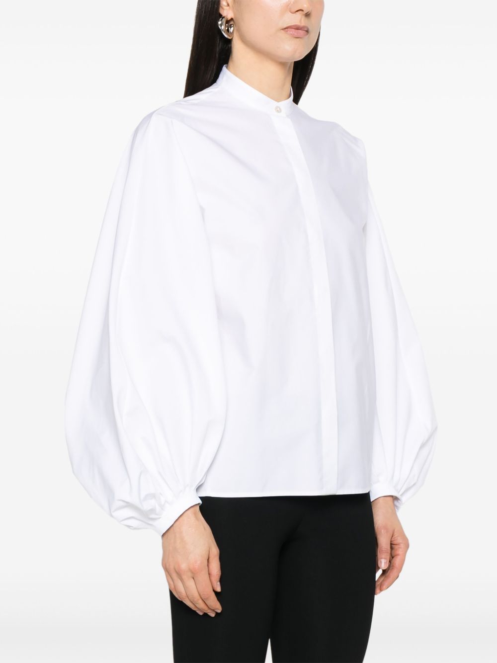 White cotton shirt with a concealed front placket, band collar, long balloon sleeves, and refined pleated detailing. Crisp poplin handfeel and a clean, elevated silhouette—perfect for SS25 – Spring/Summer 2025.