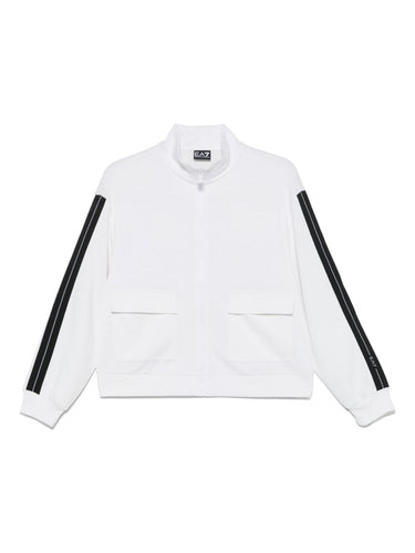 white front zip fastening two front flap pockets ribbed cuffs and hem long sleeves Logo zipped sweatshirt Size and Fit - This piece fits true to size. We recommend you get your regular size. Model is 1,75m / 5ft 8in wearing size S
