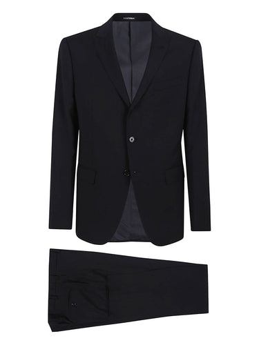 blackfront button fasteningtwo front flap pocketsnotched lapelslong sleeves Wool single-breasted suit