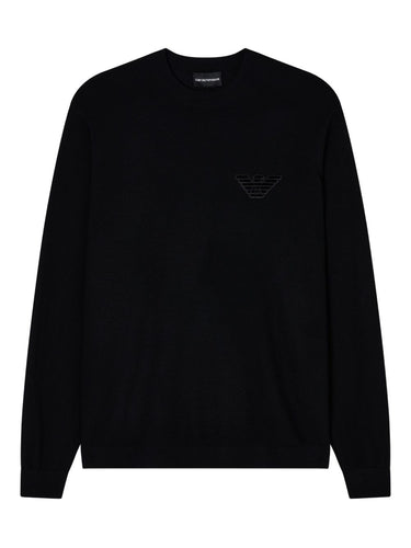 black crew neck long sleeves ribbed cuffs ribbed hem logo emblem Wool crewneck jumper