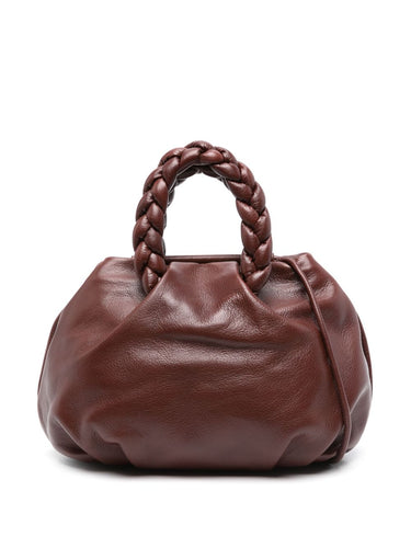 chocolate brown leather grained texture internal logo patch concealed magnetic fastening braided top handles detachable shoulder strap main compartment Bombon medium leather handbag Size and Fit - Width 9,84 in / 25 cm Height 5,91 in / 15 cm Depth 5,91 in / 15 cm Handle 3,94 in / 10 cm Strap 13,78 in / 35 cm.
