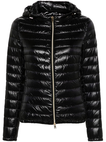 black feather down padded design quilted gold-tone logo plaque logo-engraved gold-tone hardware detachable drawstring hood front two-way zip fastening long sleeves elasticated cuffs two side zip-fastening pockets elasticated hem quilted lining Nylon short down jacket Size and Fit - This piece fits true to size. We recommend you get your regular size. Model is 1,75m / 5ft 8in wearing size 40 (IT)