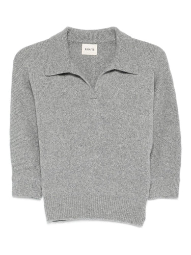 Refined and ultra-soft, this light grey sweater is knitted from 100% cashmere with a high neckline for a clean, elongated look. Three-quarter sleeves keep it modern and versatile, while ribbed cuffs and hem add subtle structure. An easy, polished layer that pairs effortlessly with tailoring or denim through the cooler months.