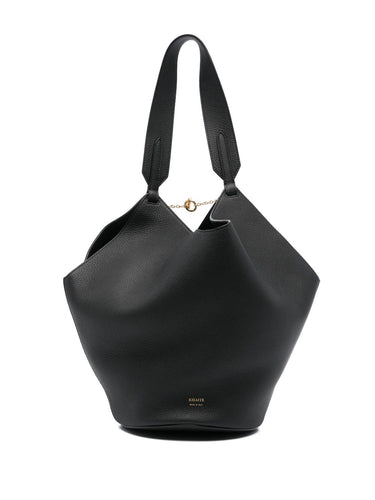 Crafted from 100% calfskin in classic black, the Lotus small bag features a refined grained texture and a distinctive toggle closure. The structured top handle and front logo print elevate its minimalist silhouette, while the fully lined single compartment keeps essentials secure and easy to access. A polished, versatile piece that transitions seamlessly from day to evening.