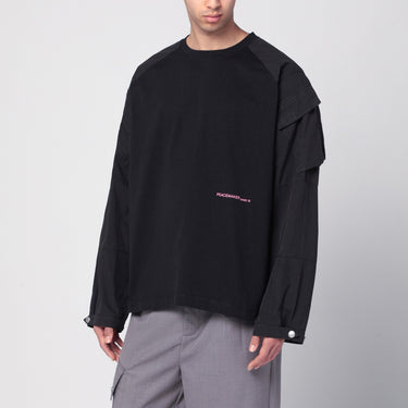 OAMC black cotton crew neck sweater, featuring long sleeves with applied flap pockets, snap-button cuffs, and contrasting logo lettering on the front. Size and Fit - Model wears size L Model measurements: Height: 189 cm Chest: 104 cm Waist: 78 cm Hips: 95 cm