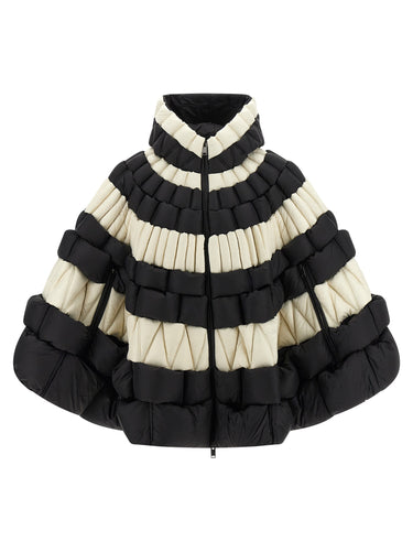 Nylon cape with braided 3D structure and goose feather padding, hood, high neck, front zip closure, side zip to pass hands. Size and Fit - oversized fit