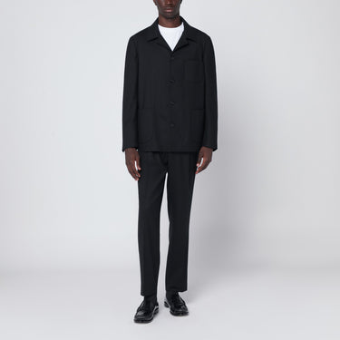 Santaniello suit in black wool blend, characterized by a shirt jacket, with long sleeves, button closure, three front pockets, and a back vent. Trousers with front closure with zip and button, belt loops, two side welt pockets, and two flap pockets with button on the back. Size and Fit - Model wears size 50 IT Model measurements: Height: 187 cm Chest: 102 cm Waist: 76 cm Hips: 92 cm