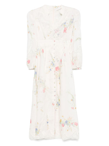 ecru front button fastening concealed rear zip fastening elasticated cuffs all-over floral print Lucky linen midi dress Size and Fit - This piece fits true to size. We recommend you get your regular size. Model is 1,75m / 5ft 8in wearing size 1 (NUM)